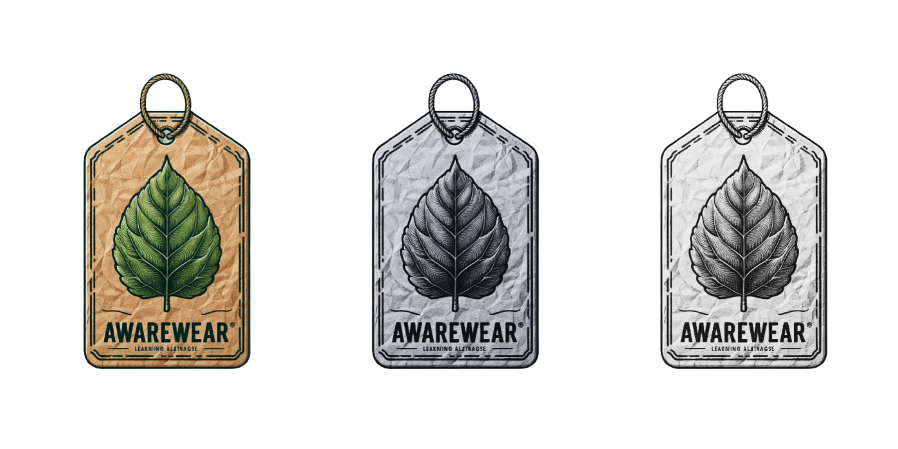 The AwareWear logo takes the shape of a clothing tag, with a vibrant green leaf cradled at its center, reflecting our commitment to the environment. It's set against a backdrop reminiscent of natural paper, enhancing its organic appeal. 'AwareWear' is written in bold letters, underscoring our focus on sustainable fashion education. A rustic border encases the logo, marrying structure with the essence of nature. The logo comes in three variants: full color on the left, displaying the leaf in its lush green; a grayscale version in the middle, for understated elegance; and a stark black and white version on the right, for classic simplicity. Each version represents our fusion of style, learning, and eco-awareness.