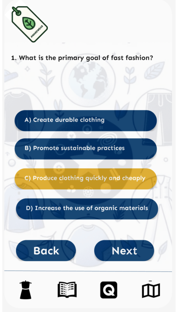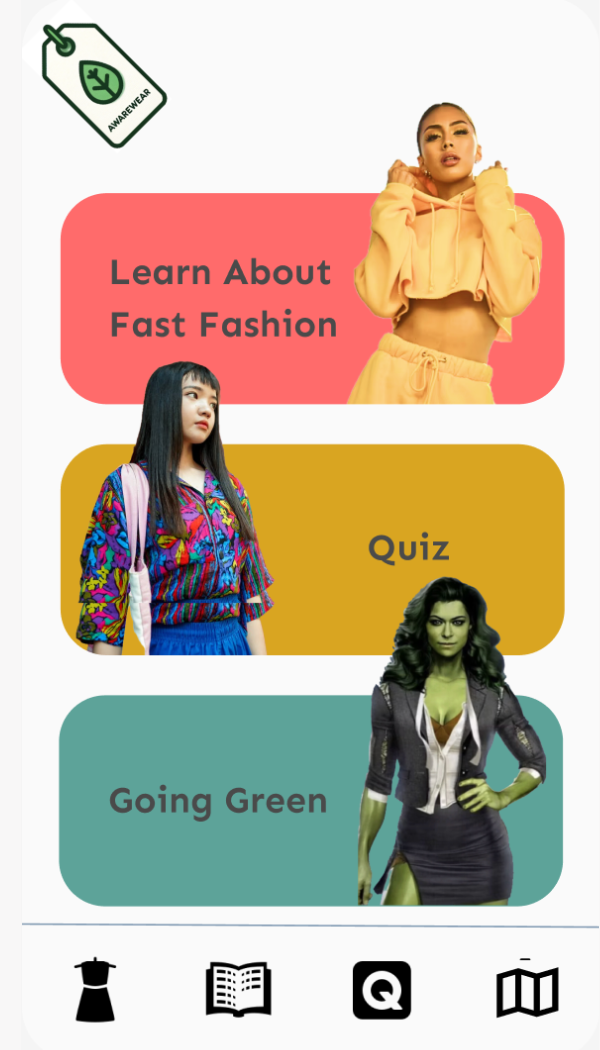 This icon will be the link to our quiz. This is where people will test their knowledge to see how much or little they know about fast fashion and textile sustainability.