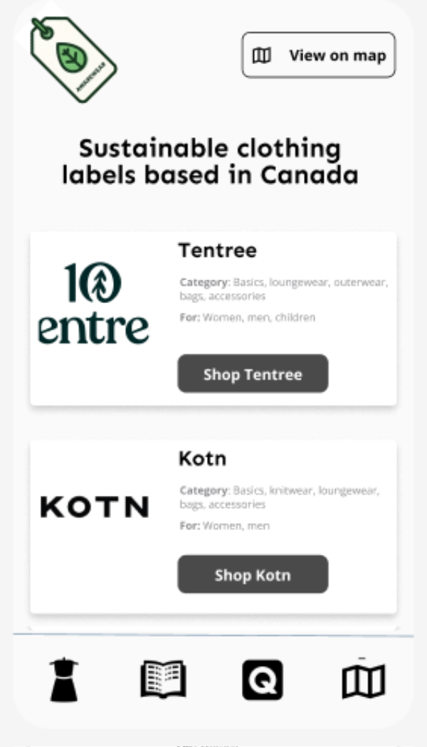 This icon will lead users to our fashion sustainability resources. There will be a map feature where users will be able to navigate to textile recycling depots, thrift stores and other resources.